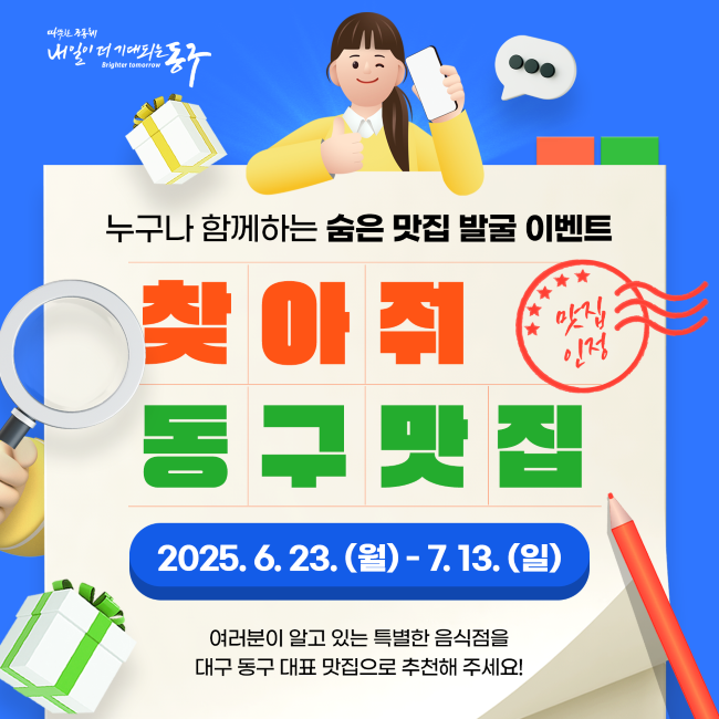 대구 동구청(구청장 윤석준)은 오는 13일까지 숨은 맛집 발굴을 위한 '찾아줘 맛집!' SNS 이벤트를 실시한다.