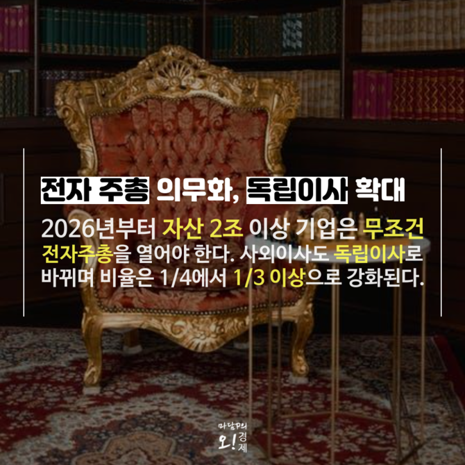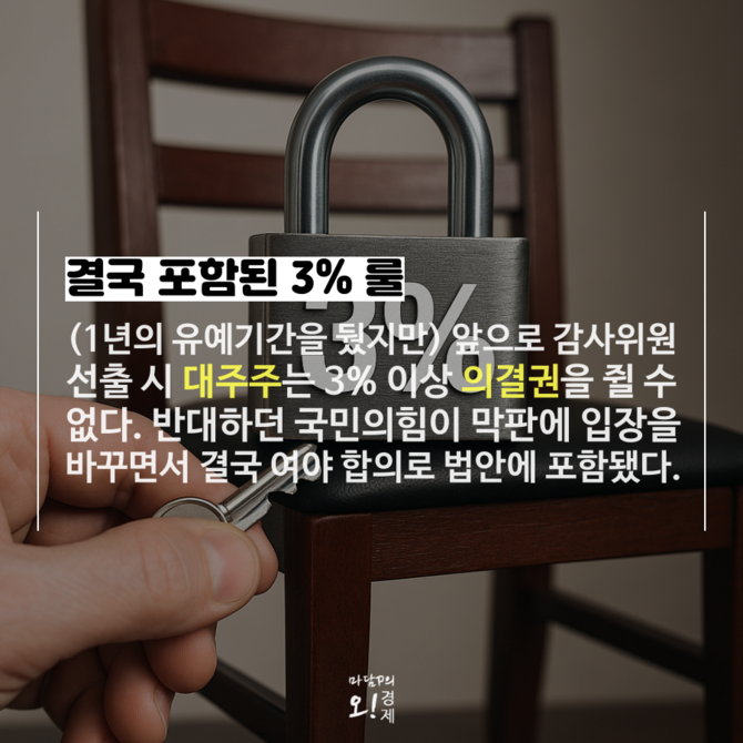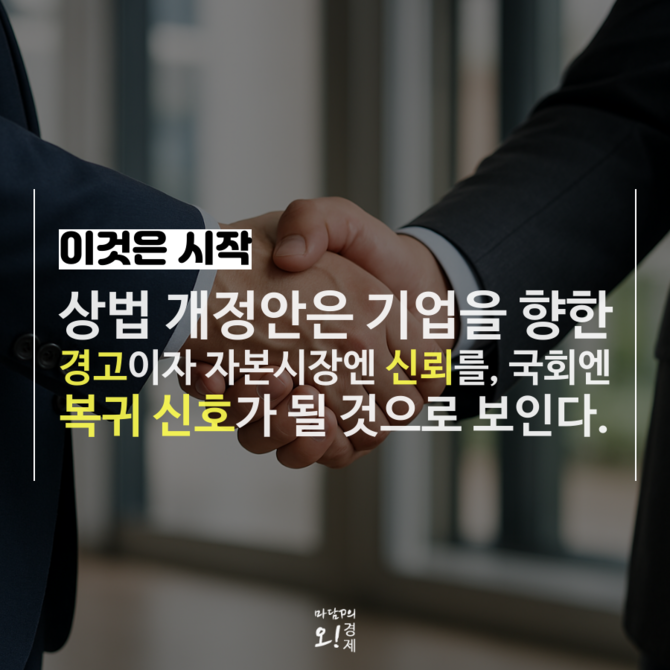 이번 합의는 이사회가 소액주주 눈치를 보는 시대의 서막이다. 국회가 정쟁이 아닌 정책에서 손을 맞잡은 보기 드문 사례로 향후 자본시장 신뢰 회복의 계기가 될지 주목된다.