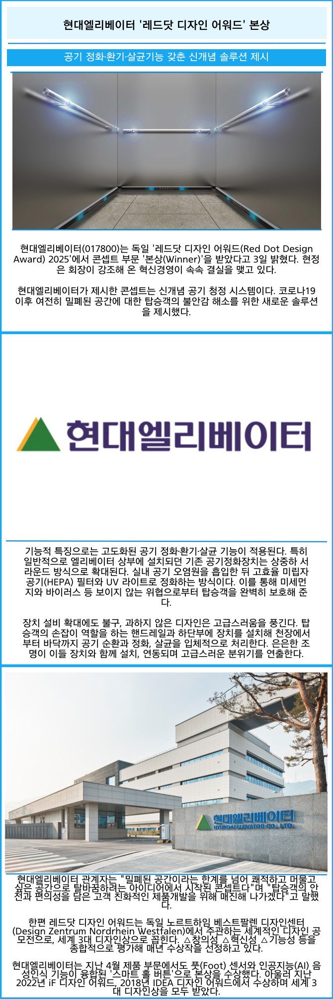 [프라임경제] 현대엘리베이터(017800)는 독일 '레드닷 디자인 어워드(Red Dot Design Award) 2025'에서 콘셉트 부문 '본상(Winner)'을 받았다고 3일 밝혔다. 현정은 회장이 강조해 온 혁신경영이 속속 결실을 맺고 있다.