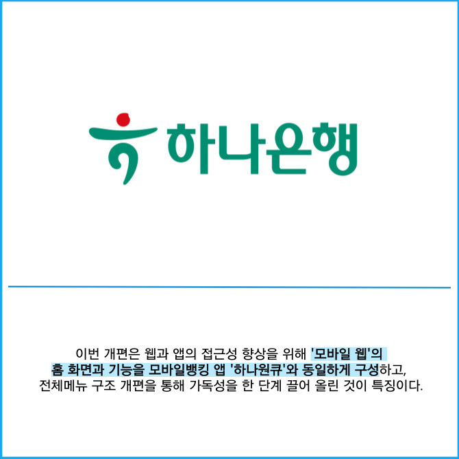 [프라임경제] 하나은행은 고객 편의성을 높이기 위해 은행 '모바일 웹'을 새롭게 개편했다고 3일 밝혔다.