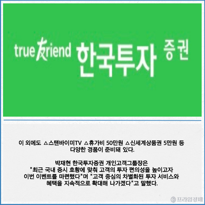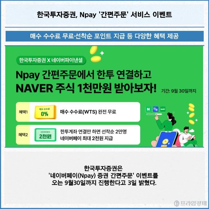 [프라임경제] 한국투자증권은 '네이버페이(Npay) 증권 간편주문' 이벤트를 오는 9월30일까지 진행한다고 3일 밝혔다.