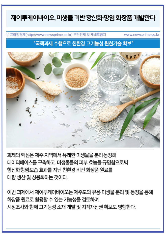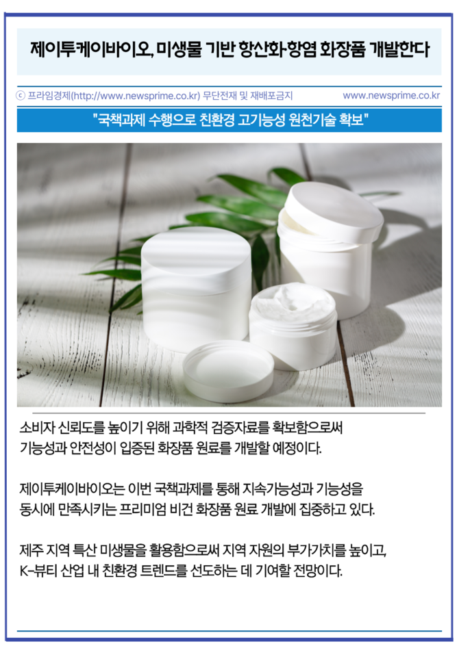 [프라임경제] 제이투케이바이오(420570)는 제주 유용 미생물자원 구축 기반을 통한 스킨바이오틱스 비건 화장품 개발 국책과제를 수행 중이라고 3일 밝혔다.