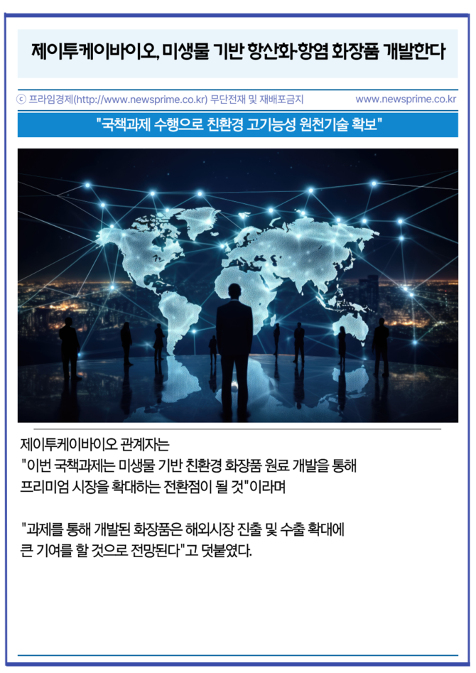 이번 과제를 계기로 제이투케이바이오는 표준화된 고기능성 화장품 원료 개발을 통해 원천기술을 확보함과 동시에, 글로벌 친환경 화장품 시장에서 기술 경쟁력을 한층 강화할 것으로 전망된다.