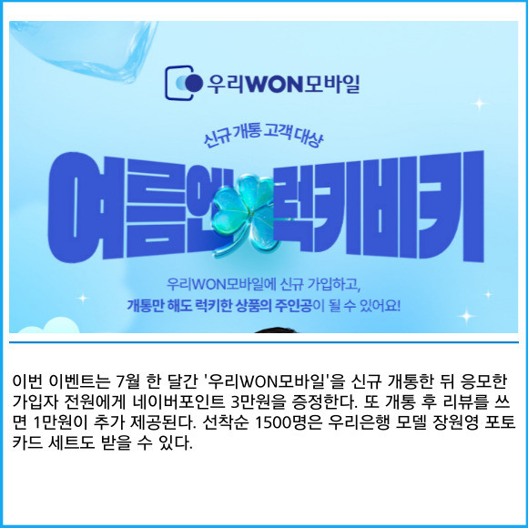 [프라임경제] 우리은행이 알뜰폰 서비스 '우리WON모바일'의 7월 여름맞이 이벤트를 실시한다고 3일 밝혔다.