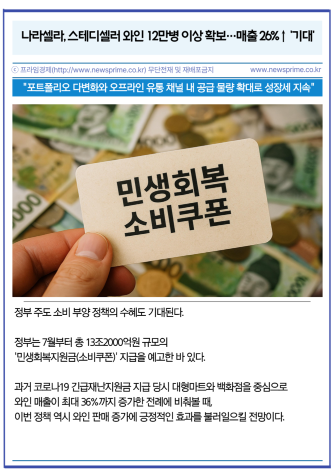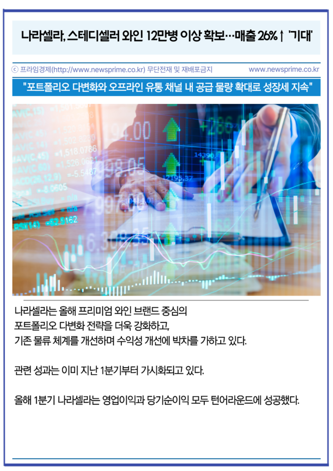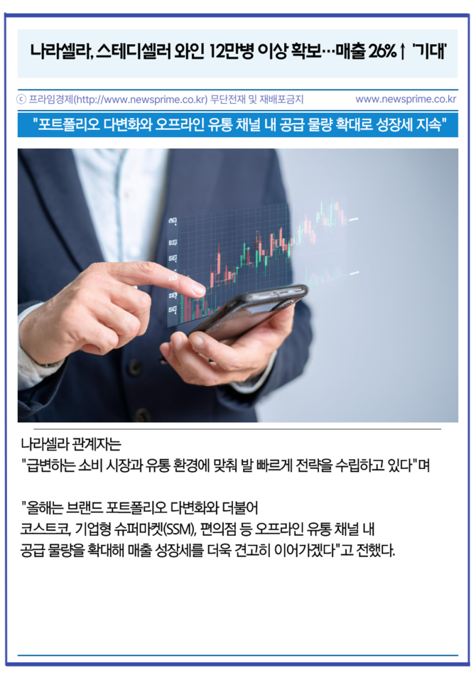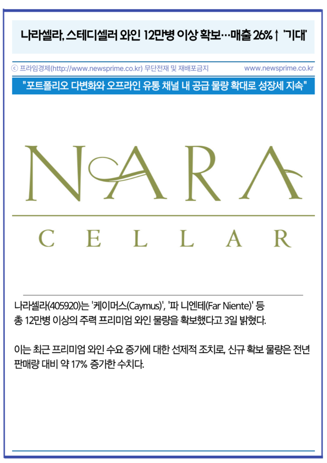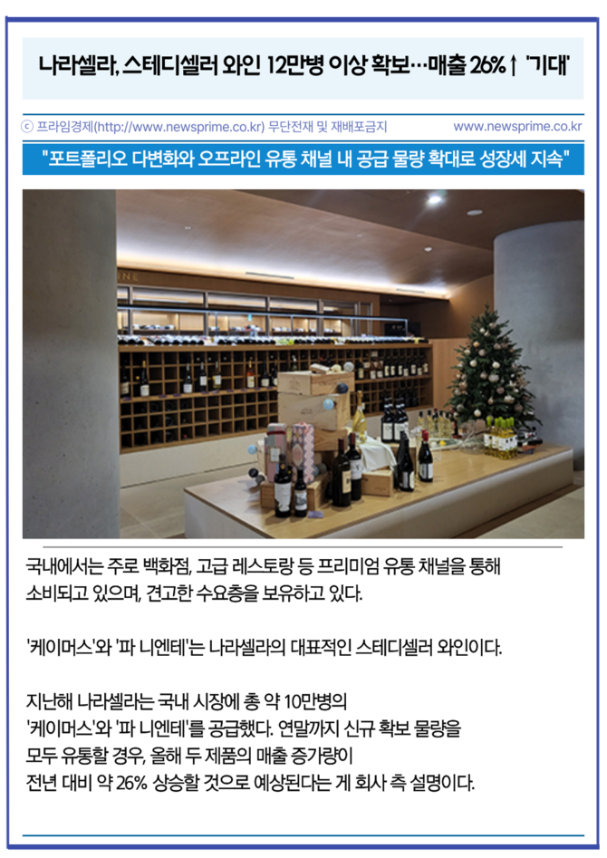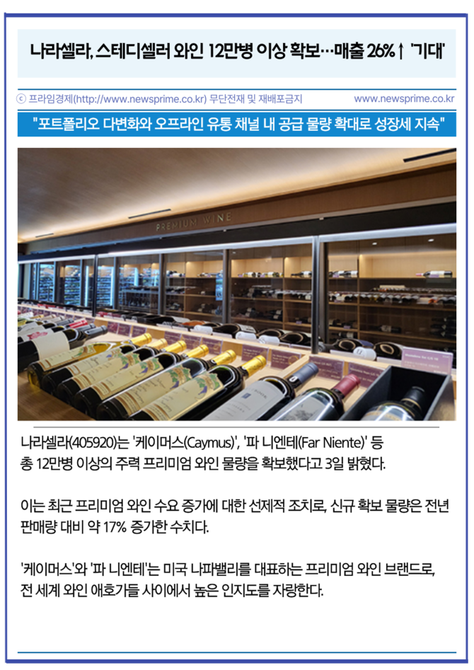 [프라임경제] 나라셀라(405920)는 '케이머스(Caymus)', '파 니엔테(Far Niente)' 등 총 12만병 이상의 주력 프리미엄 와인 물량을 확보했다고 3일 밝혔다. 이는 최근 프리미엄 와인 수요 증가에 대한 선제적 조치로, 신규 확보 물량은 전년 판매량 대비 약 17% 증가한 수치다.