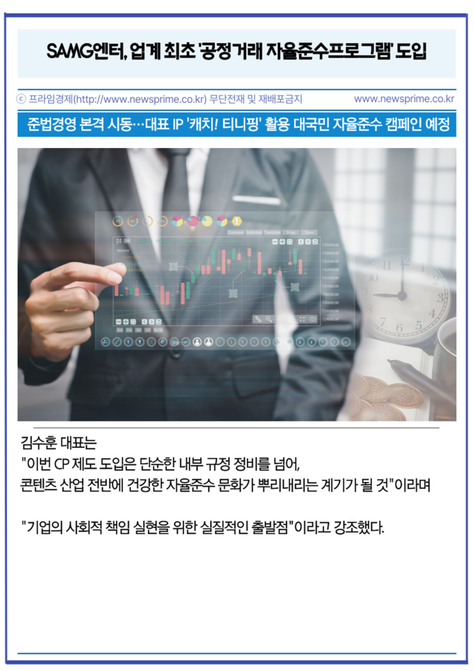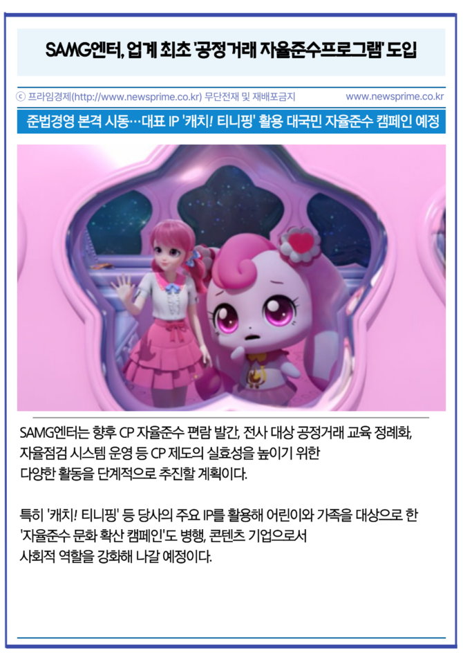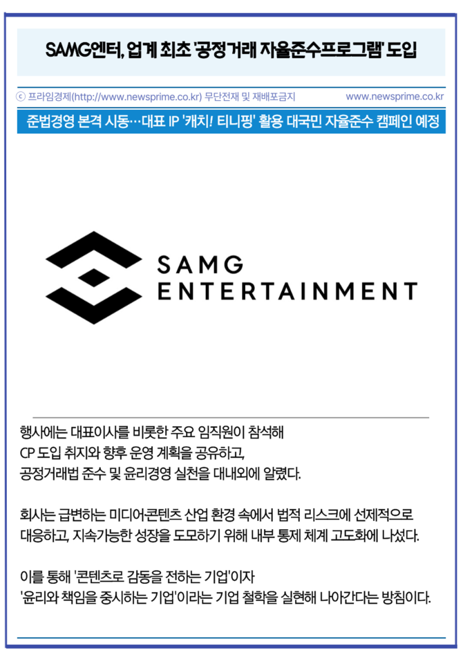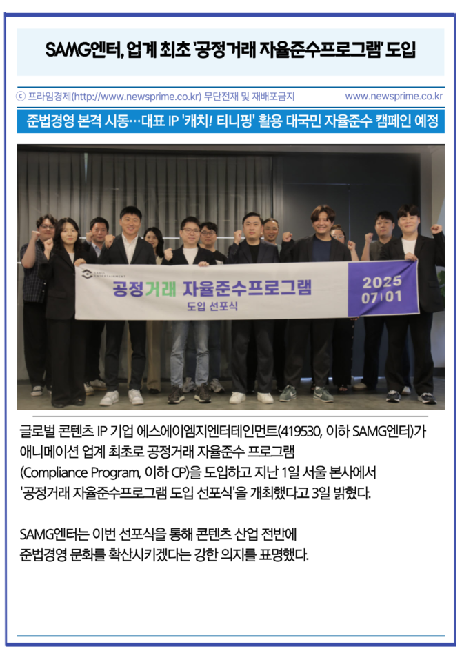 [프라임경제] 글로벌 콘텐츠 IP 기업 에스에이엠지엔터테인먼트(419530, 이하 SAMG엔터)가 애니메이션 업계 최초로 공정거래 자율준수 프로그램(Compliance Program, 이하 CP)을 도입하고 지난 1일 서울 본사에서 '공정거래 자율준수프로그램 도입 선포식'을 개최했다고 3일 밝혔다.