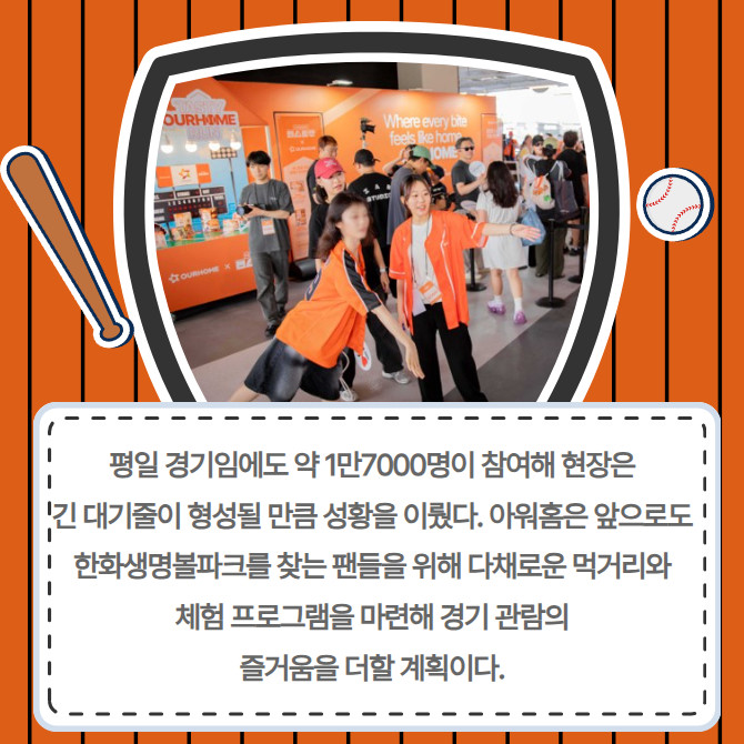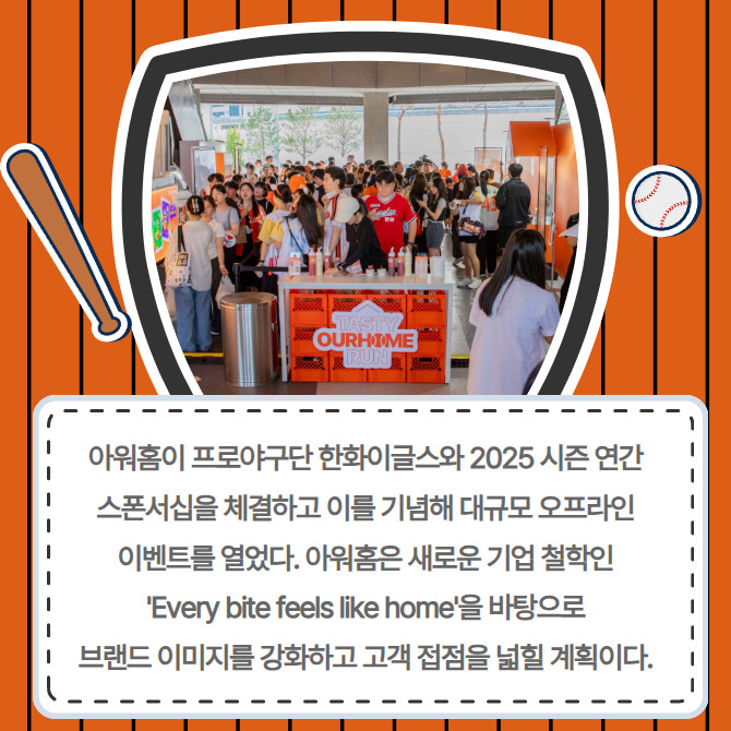 [프라임경제] 아워홈이 프로야구단 한화이글스와 2025 시즌 연간 스폰서십을 체결하고 이를 기념해 대규모 오프라인 이벤트를 열었다. 아워홈은 새로운 기업 철학인 'Every bite feels like home'을 바탕으로 브랜드 이미지를 강화하고 고객 접점을 넓힐 계획이다.