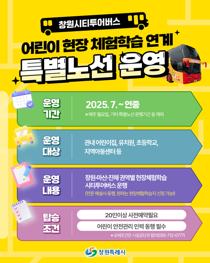 한편, 창원시는 여름철 낮 시간대 무더위와 휴가철 외부 여행 수요 분산을 고려해, 7~8월 두 달간 시티투어버스를 한시적으로 단축 운행하며, 기존 주 6일(화~일), 일 6회 운행하던 것을 주 4일(목~일), 일 4회 운행으로 조정해 탄력적으로 운영할 방침이다.