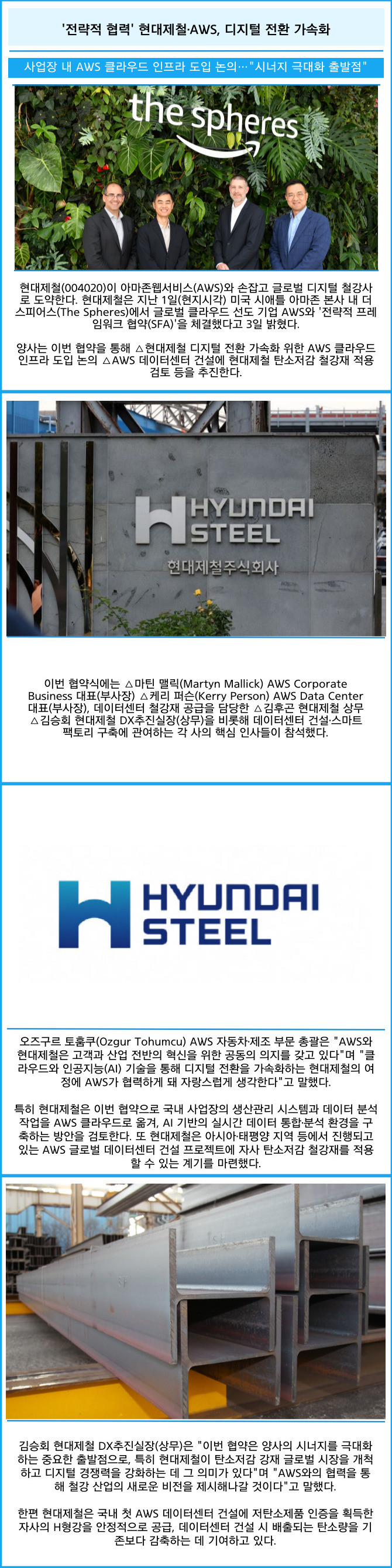 [프라임경제] 현대제철(004020)이 아마존웹서비스(AWS)와 손잡고 글로벌 디지털 철강사로 도약한다. 현대제철은 지난 1일(현지시각) 미국 시애틀 아마존 본사 내 더 스피어스(The Spheres)에서 글로벌 클라우드 선도 기업 AWS와 '전략적 프레임워크 협약(SFA)'을 체결했다고 3일 밝혔다.