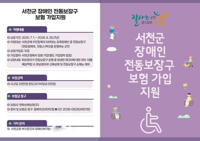 서천군은 전동보장구(전동휠체어, 전동스쿠터)를 이용하는 장애인의 안전과 권익 보호를 위해 '장애인 전동보장구 배상책임보험' 가입을 지원한다.