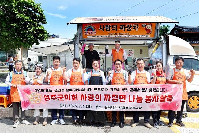 성주군의회는 지난 1일 의회 개원 3주년을 맞아 별도의 기념식을 생략하고 성주읍 은혜나눔 사회적협동조합에서 지역어르신들과 취약계층 주민들을 위한 짜장면 나눔 봉사활동을 실시했다.