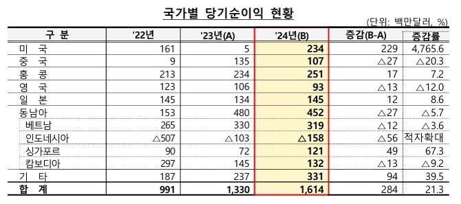 국가별로는 미국에서 2억2000만달러, 싱가포르에서 4900만달러씩 순이익이 증가했다. 다만 인도네시아와 중국은 순이익이 각각 5600만달러, 2700만달러 감소했다.