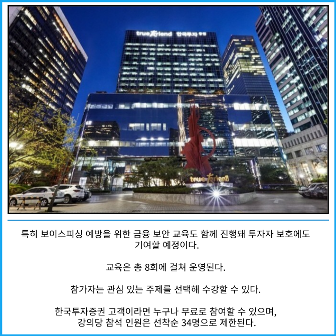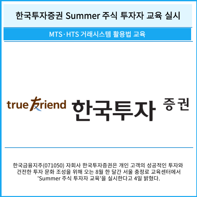 [프라임경제] 한국금융지주(071050) 자회사 한국투자증권은 개인 고객의 성공적인 투자와 건전한 투자 문화 조성을 위해 오는 8월 한 달간 서울 충정로 교육센터에서 'Summer 주식 투자자 교육'을 실시한다고 4일 밝혔다.