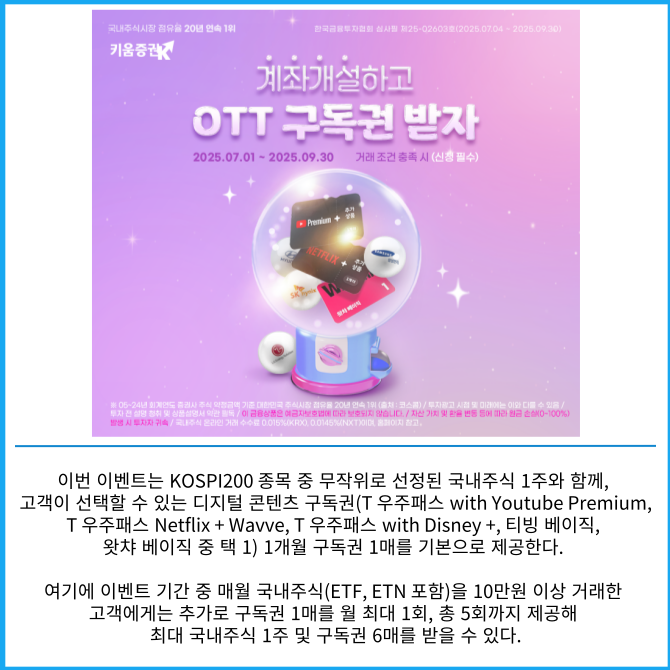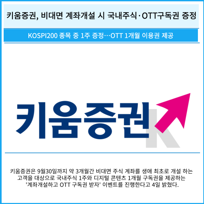 [프라임경제] 키움증권은 9월30일까지 약 3개월간 비대면 주식 계좌를 생애 최초로 개설 하는 고객을 대상으로 국내주식 1주와 디지털 콘텐츠 1개월 구독권을 제공하는 '계좌개설하고 OTT 구독권 받자' 이벤트를 진행한다고 4일 밝혔다.