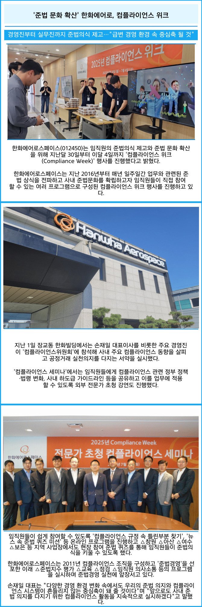 [프라임경제] 한화에어로스페이스(012450)는 임직원의 준법의식 제고와 준법 문화 확산을 위해 지난달 30일부터 이달 4일까지 '컴플라이언스 위크(Compliance Week)' 행사를 진행했다고 밝혔다.