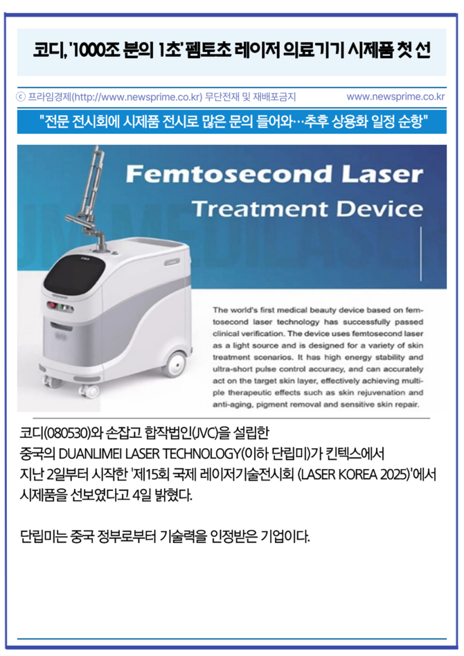 [프라임경제] 코디(080530)와 손잡고 합작법인(JVC)을 설립한 중국의 DUANLIMEI LASER TECHNOLOGY(이하 단립미)가 킨텍스에서 지난 2일부터 시작한 '제15회 국제 레이저기술전시회 (LASER KOREA 2025)'에서 시제품을 선보였다고 4일 밝혔다.