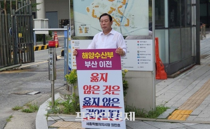 최민호 세종시장이 해양수산부의 부산 이전에 반대하며 지난 2일부터 진행해 온 1인 시위를 4일 정부세종청사 앞에서 마무리했다. 이번 1인 시위는 해수부 이전 반대 여론 확산의 계기가 됐다는 평가를 받고 있다.