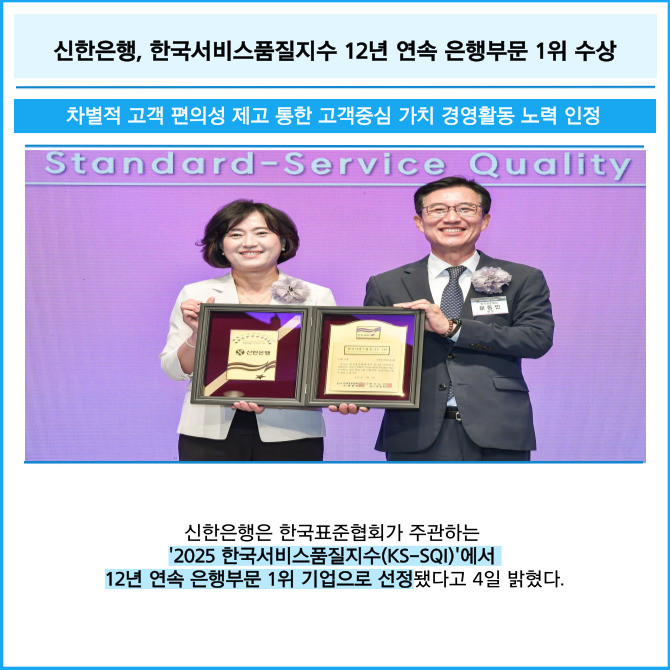 [프라임경제] 신한은행은 한국표준협회가 주관하는 '2025 한국서비스품질지수(KS-SQI)'에서 12년 연속 은행부문 1위 기업으로 선정됐다고 4일 밝혔다.