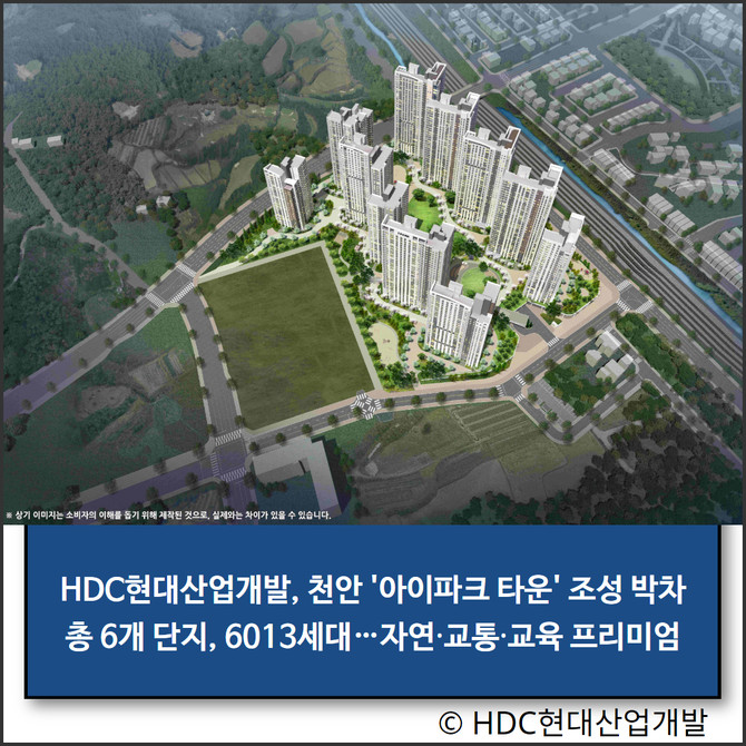 HDC현대산업개발(294870, HDC현산)이 충남 천안 성성호수공원 일대에 총 6013세대 규모 '아이파크' 브랜드 주거타운 조성에 나선다. 천안 아이파크 시티(1126세대)를 시작으로 부대1·부성3·4·5·6구역이 순차 공급될 예정이다.
