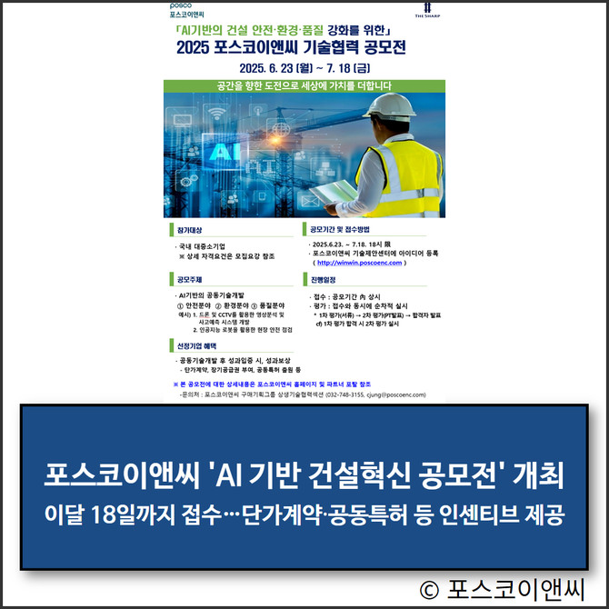 포스코이앤씨가 파트너사와 함께 '2025 기술협력 공모전'을 개최하고, 인공지능(AI) 기반 건설 기술 발굴에 나선다고 4일 밝혔다. 이번 공모전은 'AI 기반 건설 안전·환경·품질 강화'를 주제로 현장 혁신과 생산성 제고를 목표로 한다.