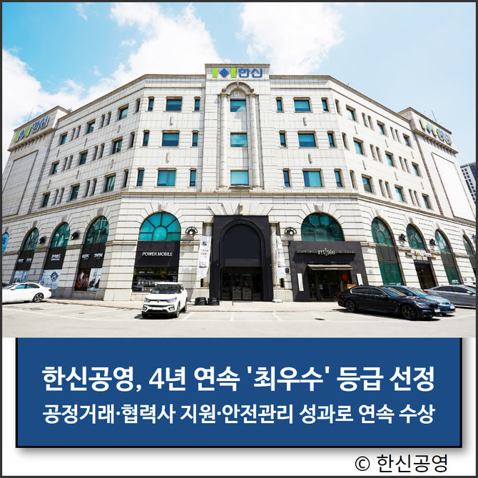 한신공영(004960)이 국토교통부 주관 '2025년 건설사업자 간 상호협력평가'에서 4년 연속 최우수 등급을 획득했다. 공정거래 실천과 협력사 동반성장 노력, 우수한 안전관리 체계가 종합적으로 높은 평가를 받았다.
