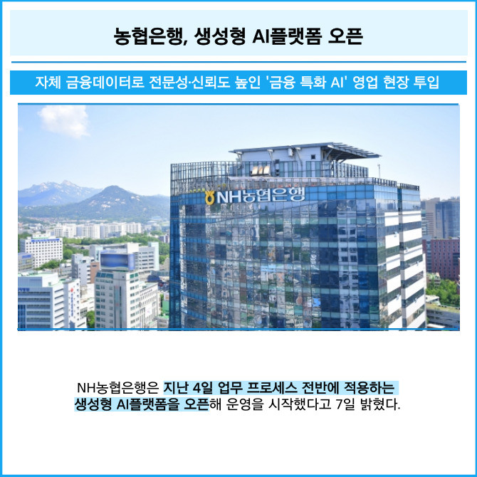 [프라임경제] NH농협은행은 지난 4일 업무 프로세스 전반에 적용하는 생성형 AI플랫폼을 오픈해 운영을 시작했다고 7일 밝혔다.