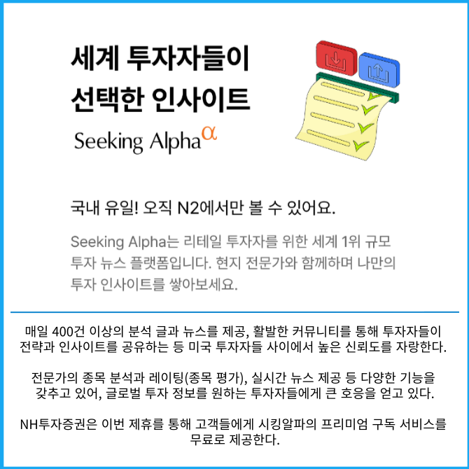 [프라임경제] NH투자증권(005940)은 국내 증권사 최초로 세계 최대 글로벌 투자정보 플랫폼인 시킹알파(Seeking Alpha)와 3년간 독점 제휴를 맺고, 기존에 연간 299달러에 제공되던 프리미엄 투자 뉴스와 글로벌 리포트를 NH투자증권 고객들에게 무료로 제공한다고 7일 밝혔다.