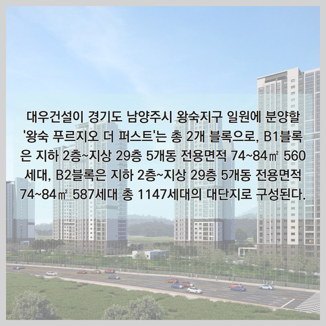 [프라임경제] 대우건설(047040)이 경기도 남양주시 왕숙지구 B1·B2블록에 '왕숙 푸르지오 더 퍼스트' 총 1147세대를 분양할 예정이다.
