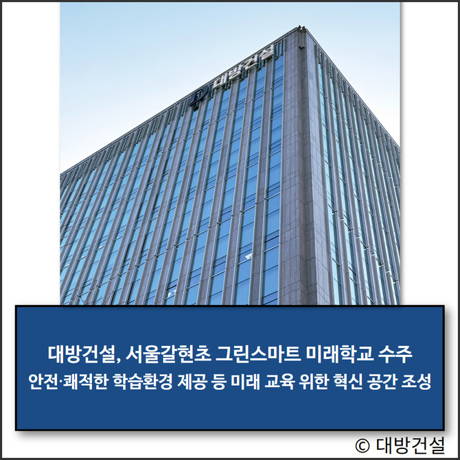 대방건설이 서울특별시 서부교육지원청이 발주한 '서울갈현초등학교 그린스마트 미래학교 및 복합화시설 증개축공사'를 수주했다.