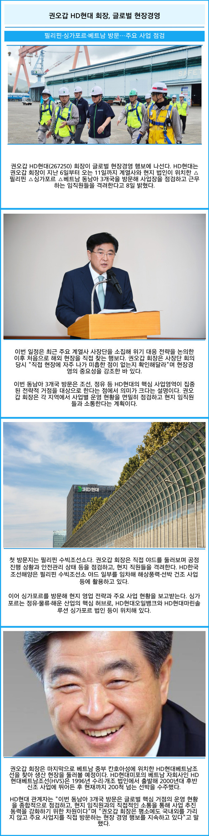 [프라임경제] 권오갑 HD현대(267250) 회장이 글로벌 현장경영 행보에 나선다. HD현대는 권오갑 회장이 지난 6일부터 오는 11일까지 계열사와 현지 법인이 위치한 △필리핀 △싱가포르 △베트남 동남아 3개국을 방문해 사업장을 점검하고 근무하는 임직원들을 격려한다고 8일 밝혔다.