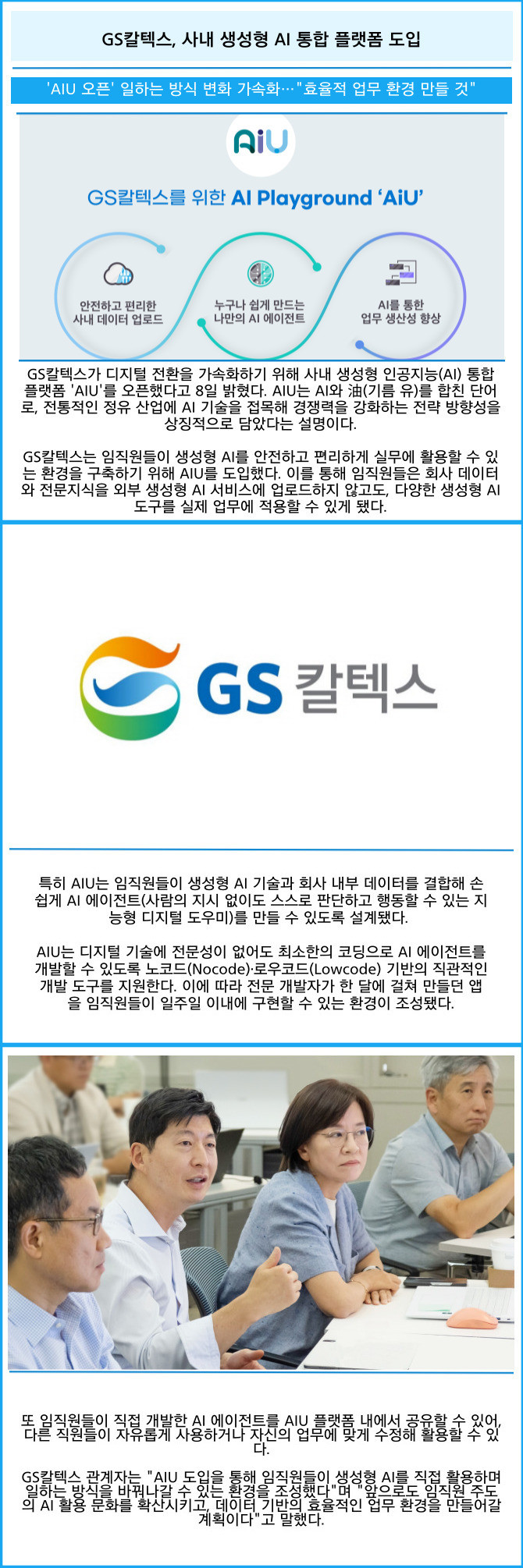 [프라임경제] GS칼텍스가 디지털 전환을 가속화하기 위해 사내 생성형 인공지능(AI) 통합 플랫폼 'AIU'를 오픈했다고 8일 밝혔다. AIU는 AI와 油(기름 유)를 합친 단어로, 전통적인 정유 산업에 AI 기술을 접목해 경쟁력을 강화하는 전략 방향성을 상징적으로 담았다는 설명이다.