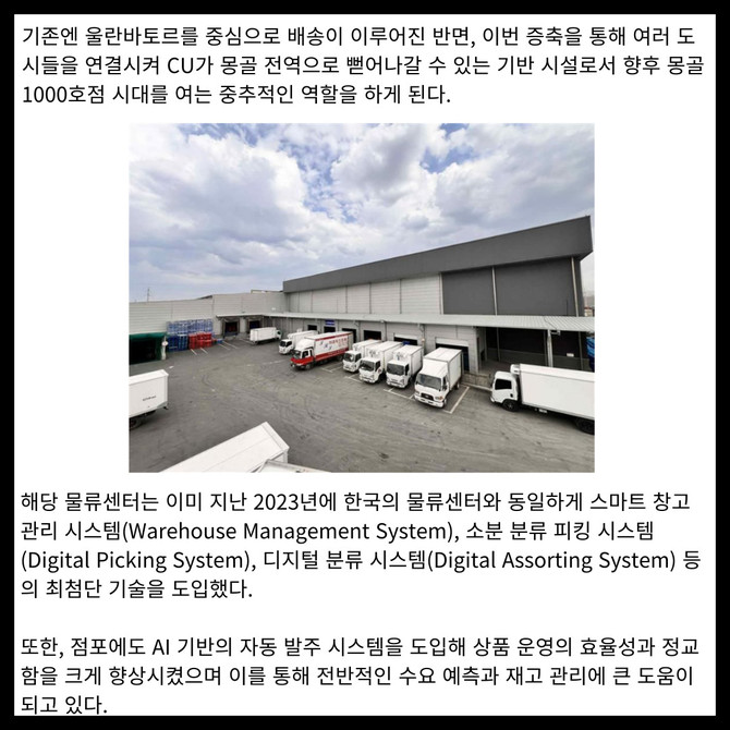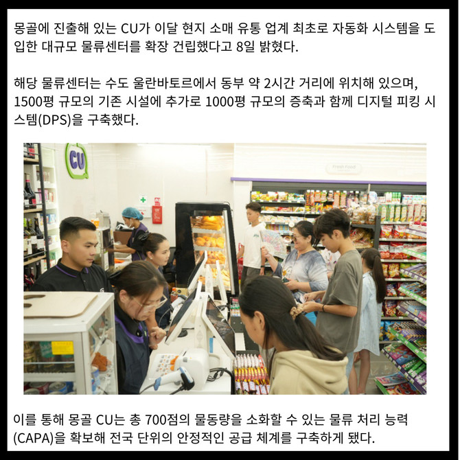 [프라임경제] 몽골에 진출해 있는 CU가 이달 현지 소매 유통 업계 최초로 자동화 시스템을 도입한 대규모 물류센터를 확장 건립했다고 8일 밝혔다.