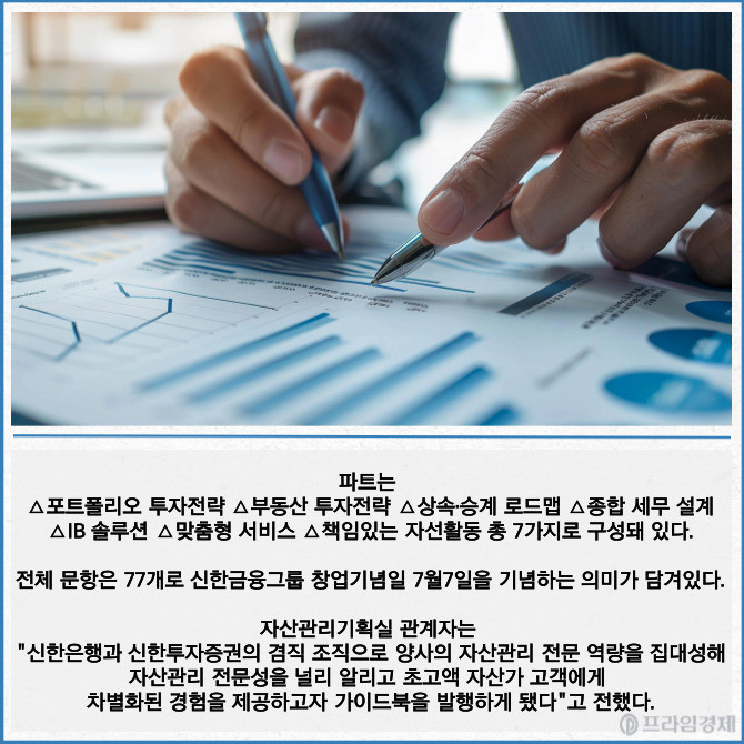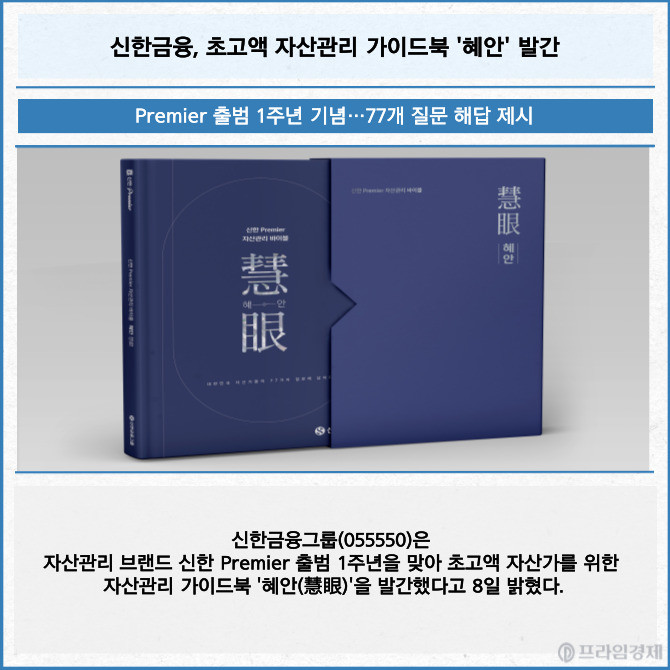 [프라임경제] 신한금융그룹(055550)은 자산관리 브랜드 신한 Premier 출범 1주년을 맞아 초고액 자산가를 위한 자산관리 가이드북 '혜안(慧眼)'을 발간했다고 8일 밝혔다.
