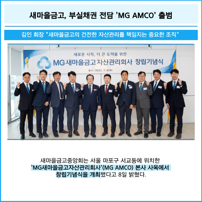 [프라임경제] 새마을금고중앙회는 서울 마포구 서교동에 위치한 'MG새마을금고자산관리회사'(MG AMCO) 본사 사옥에서 창립기념식을 개최했다고 8일 밝혔다.