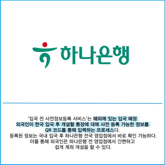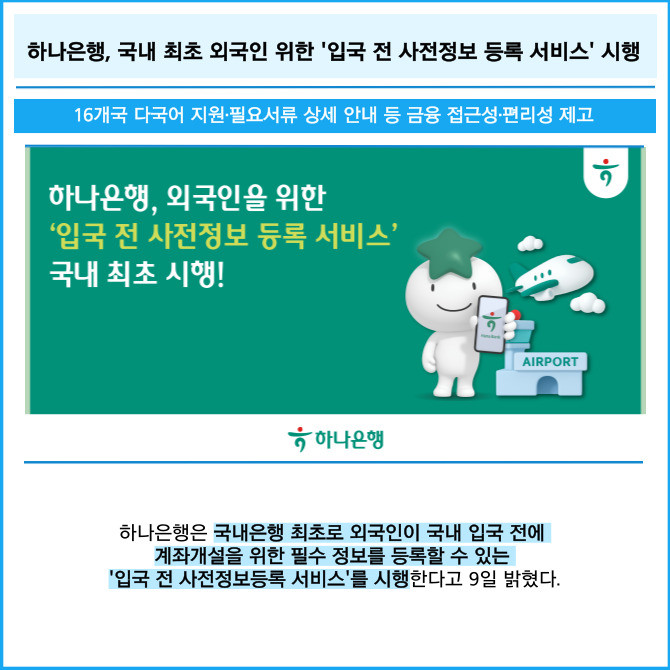 [프라임경제] 하나은행은 국내은행 최초로 외국인이 국내 입국 전에 계좌개설을 위한 필수 정보를 등록할 수 있는 '입국 전 사전정보등록 서비스'를 시행한다고 9일 밝혔다.