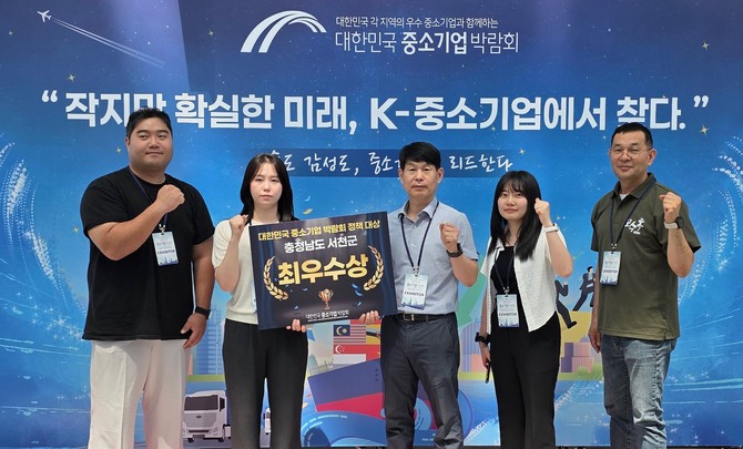 [프라임경제] 충남 서천군(군수 김기웅)이 지난 3일부터 5일까지 부산 벡스코 제1전시장에서 열린 '2025 대한민국 중소기업 박람회'에서 정책 부문 '최우수상'을 수상하며, 중소기업 지원 정책의 우수성을 대외적으로 인정받았다.