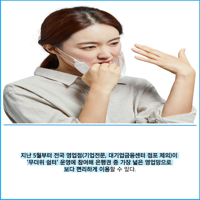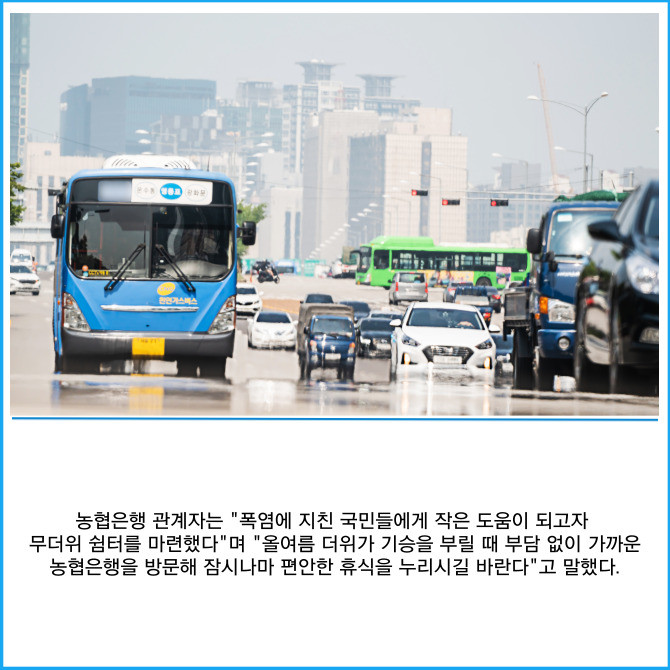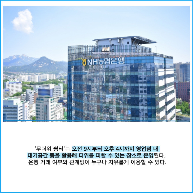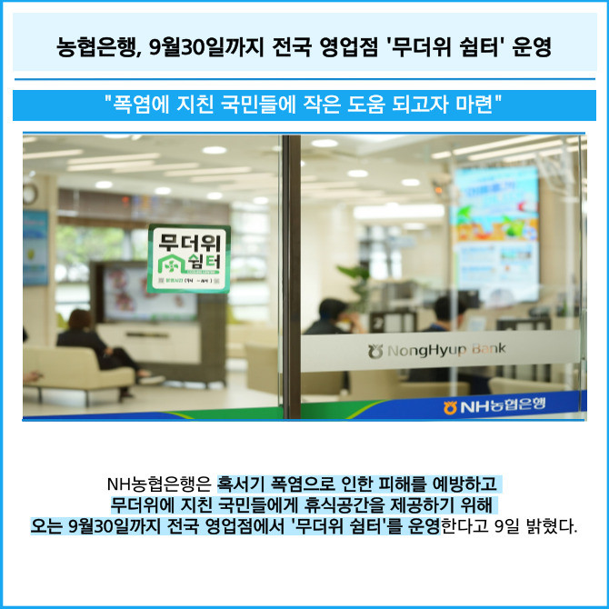 [프라임경제] NH농협은행은 혹서기 폭염으로 인한 피해를 예방하고 무더위에 지친 국민들에게 휴식공간을 제공하기 위해 오는 9월30일까지 전국 영업점에서 '무더위 쉼터'를 운영한다고 9일 밝혔다.