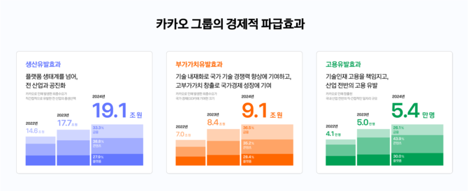[프라임경제] 카카오(035720)가 2024년 한 해 동안 창출한 경제적 파급효과가 생산유발효과 19조1000억원, 부가가치유발효과 9조1000억원, 고용유발효과 5만4000명으로 집계됐다.
