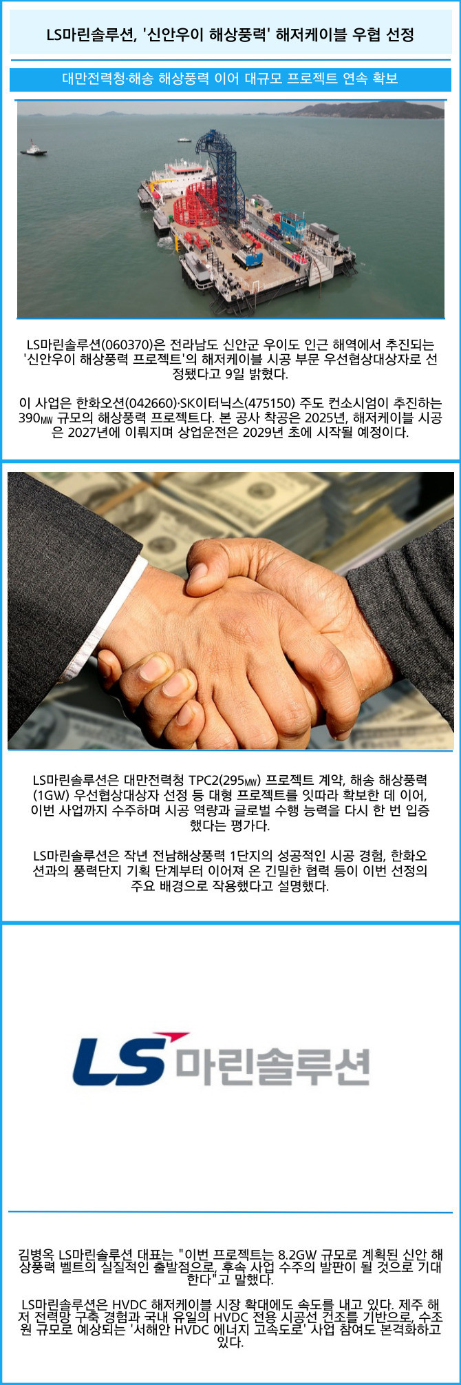 [카드] LS마린솔루션, '신안우이 해상풍력' 해저케이블 우협 선정