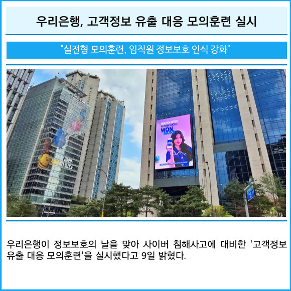 [프라임경제] 우리은행이 정보보호의 날을 맞아 사이버 침해사고에 대비한 '고객정보 유출 대응 모의훈련'을 실시했다고 9일 밝혔다.