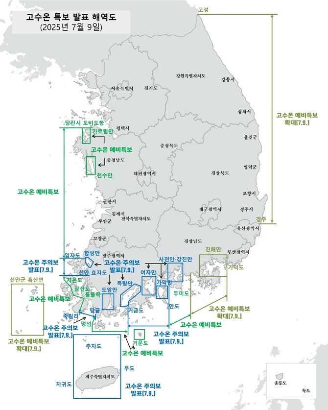 국립수산과학원이 서·남해 내만과 일부 연안 및 제주 연안에 대해 고수온 주의보를 발표(7월9일 오전 9시부)함에 따라 위기경보를 '주의' 단계에서 '경계' 단계로 상향한 것이다.
