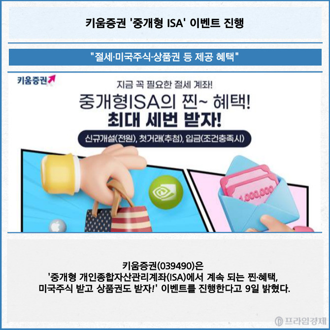 [프라임경제] 키움증권(039490)은 '중개형 개인종합자산관리계좌(ISA)에서 계속 되는 찐·혜택, 미국주식 받고 상품권도 받자!' 이벤트를 진행한다고 9일 밝혔다.