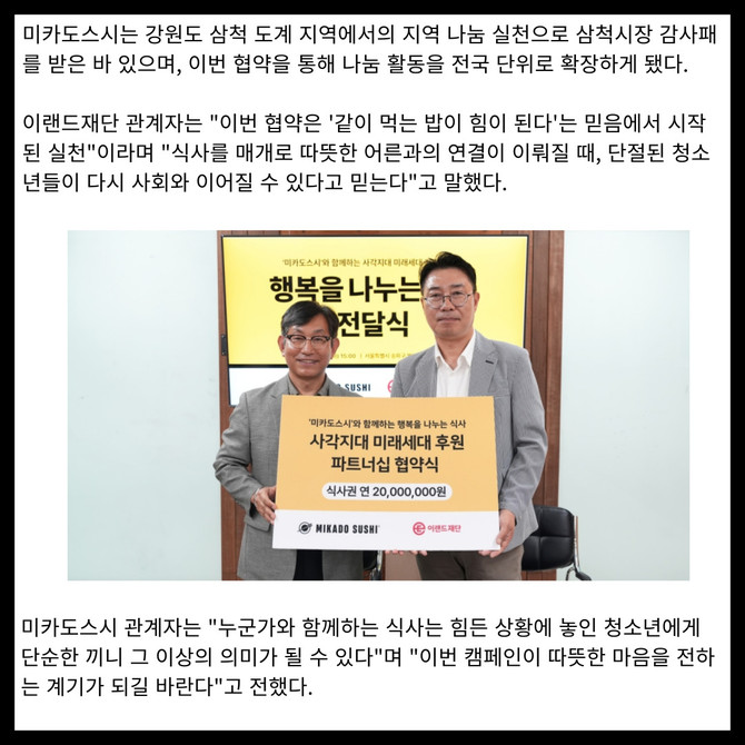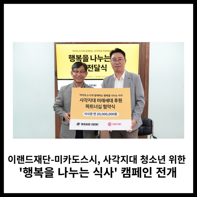 [프라임경제] 이랜드재단이 프리미엄 회전초밥 브랜드 미카도스시와 함께, 사회적 보호 체계에서 소외된 청소년을 위한 외식 지원 캠페인 '행복을 나누는 식사'를 전개한다.