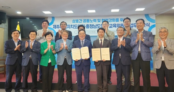 오승식 제주도의회 교육위원장도 "지방의회 간 정책 교류가 실질적인 교육의 변화를 이끌 수 있다는 믿음 아래 이번 협약을 기쁘게 맞이하며, 지속적이고 내실 있는 협력이 이어지길 기대한다"고 밝혔다.