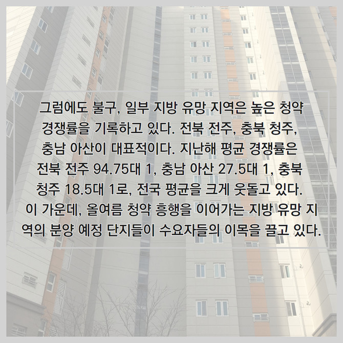 [프라임경제] 올여름 지방 유망 지역에서 청약 열기가 이어지며 분양대전이 예상되는 가운데, 수도권과 지방 간 청약 양극화 속에서도 일부 지역은 높은 관심을 받고 있다.