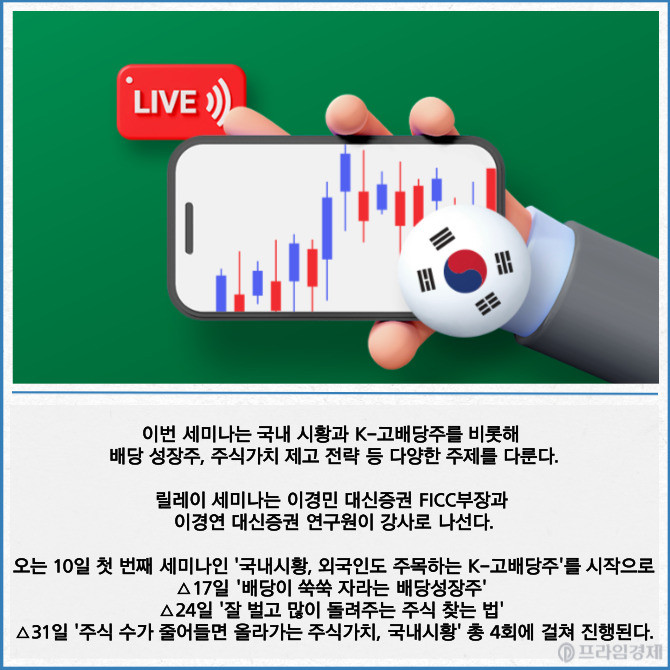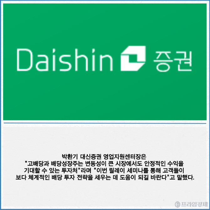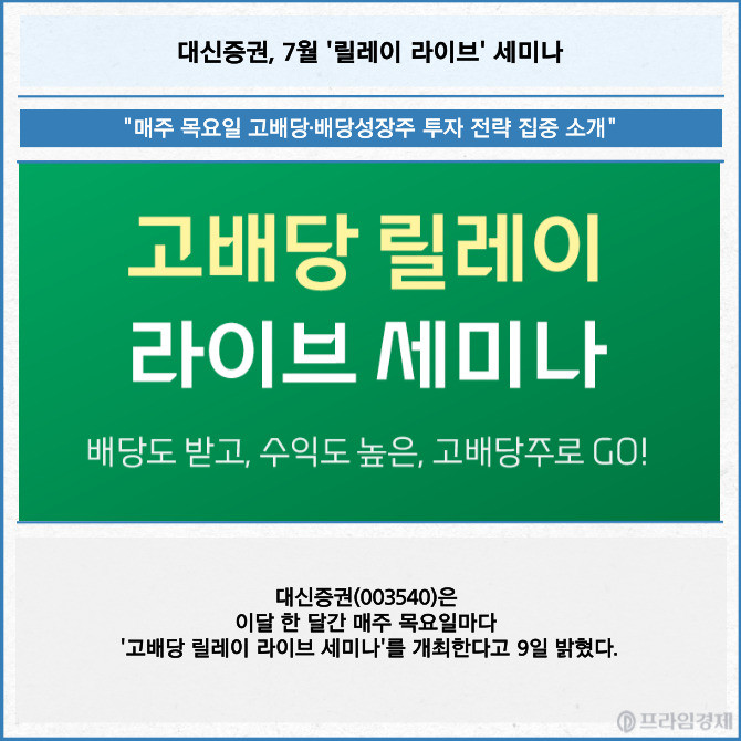 [프라임경제] 대신증권(003540)은 이달 한 달간 매주 목요일마다 '고배당 릴레이 라이브 세미나'를 개최한다고 9일 밝혔다.