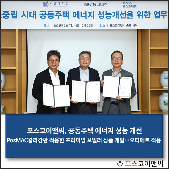 포스코이앤씨가 지난 7일 경동나비엔(009450), 서울대학교 건설환경종합연구소와 공동주택에 최적화된 에너지 절감 시스템 개발을 위한 업무협약을 체결했다.