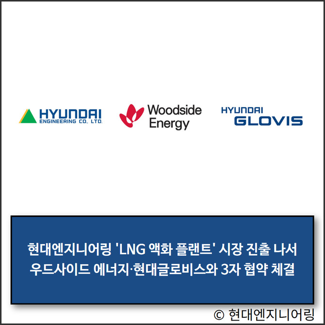 현대엔지니어링이 호주 우드사이드 에너지(Woodside Energy), 현대글로비스와 'LNG액화 사업 개발'을 위한 3자간 업무협약을 체결했다.