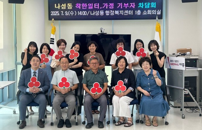 세종시 나성동지역사회보장협의체(공동위원장 박재혁·박찬양)가 지난 9일 나성동 행정복지센터 소회의실에서 착한일터와 착한가정에 참여하는 기부자들을 초청해 감사의 마음을 전하는 차담회를 열었다.