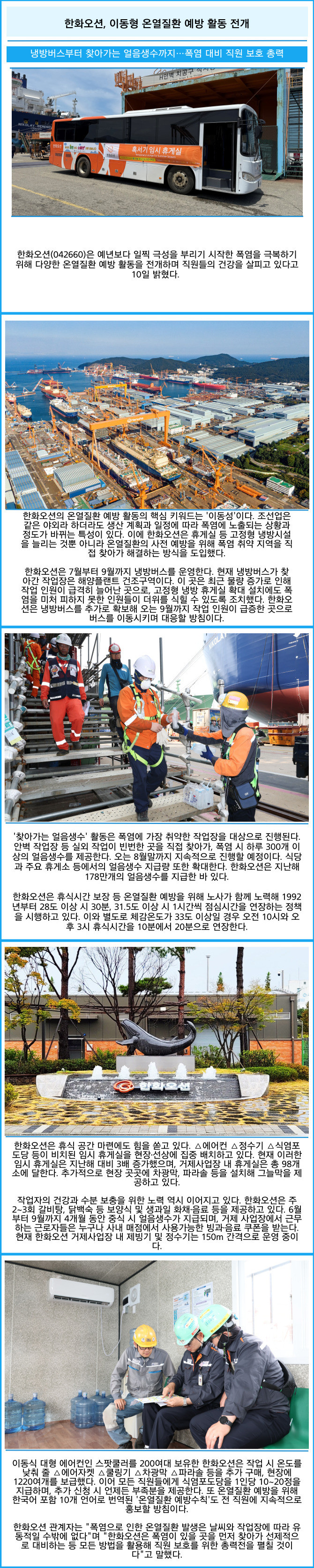 [프라임경제] 한화오션(042660)은 예년보다 일찍 극성을 부리기 시작한 폭염을 극복하기 위해 다양한 온열질환 예방 활동을 전개하며 직원들의 건강을 살피고 있다고 10일 밝혔다.